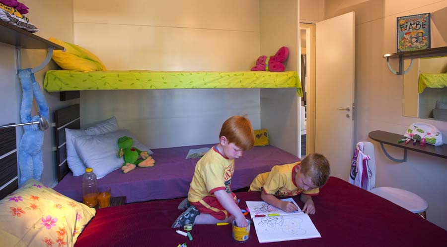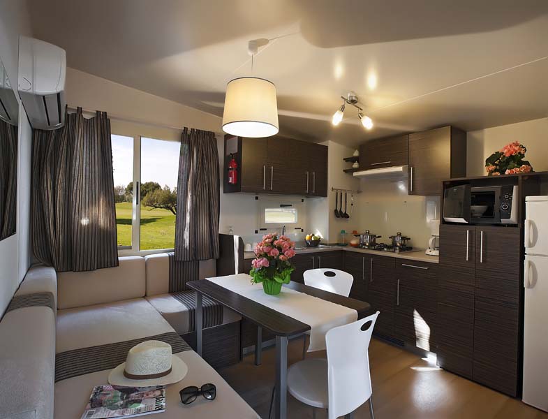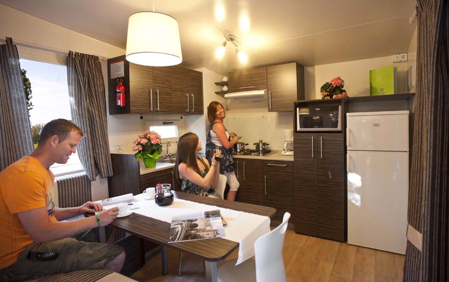 hu stay Easy L Plus er velindrettede mobilhomes på 32m2. De består af køkken/stue, 2 selvstændige soveværelser, det ene er med dobbeltseng og det andet med køjeseng og enkeltseng. Der er hele 2 badeværelser med toilet og bad. I køkkenet finder I komfur med 3 gasblus, køleskab, køkkengrej, service og en dejlig siddegruppe omkring bordet. Udenfor er en integreret overdækket terrasse med spiseplads/møbler og havemøbler. Mobilhomes har aircondition.