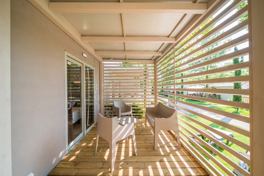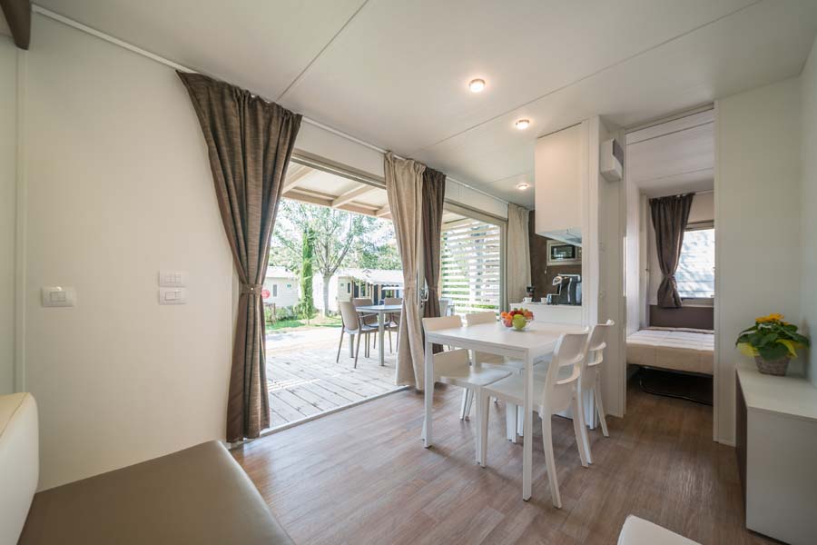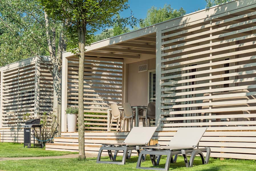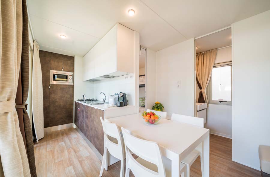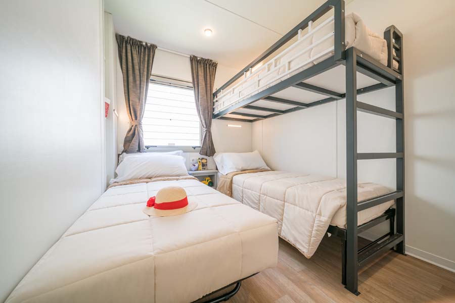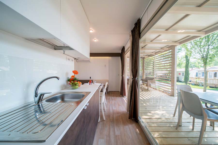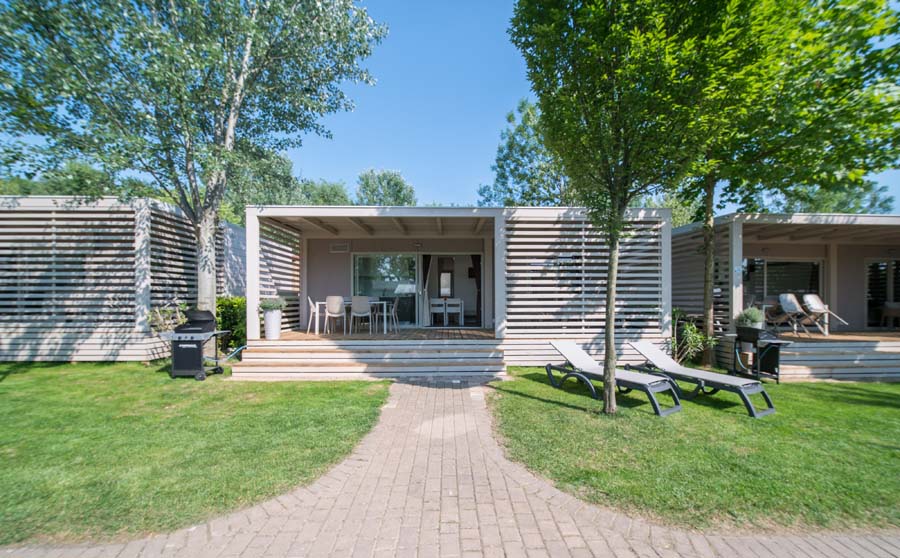 hu stay Excellence i sofistikeret design og med luksusmøbler er hele 58 m2. Lyse rum, luksus indretning og udstyret med total komfort i tankerne. Den 22 m2 store terrasse smelter sammen med opholdsstuen og sammen dannes en perfekt ramme for afslapning og familiehygge. Det fuldt udstyret køkken byder på bl.a. mikroovn, opvaskemaskine og kaffemaskine, der to soveværelser, det ene er med dobbeltseng og udgangs til terrassen og det andet med køjeseng og enkeltseng, samt hele 2 badeværelser med toilet og bad. Der er aircondition.